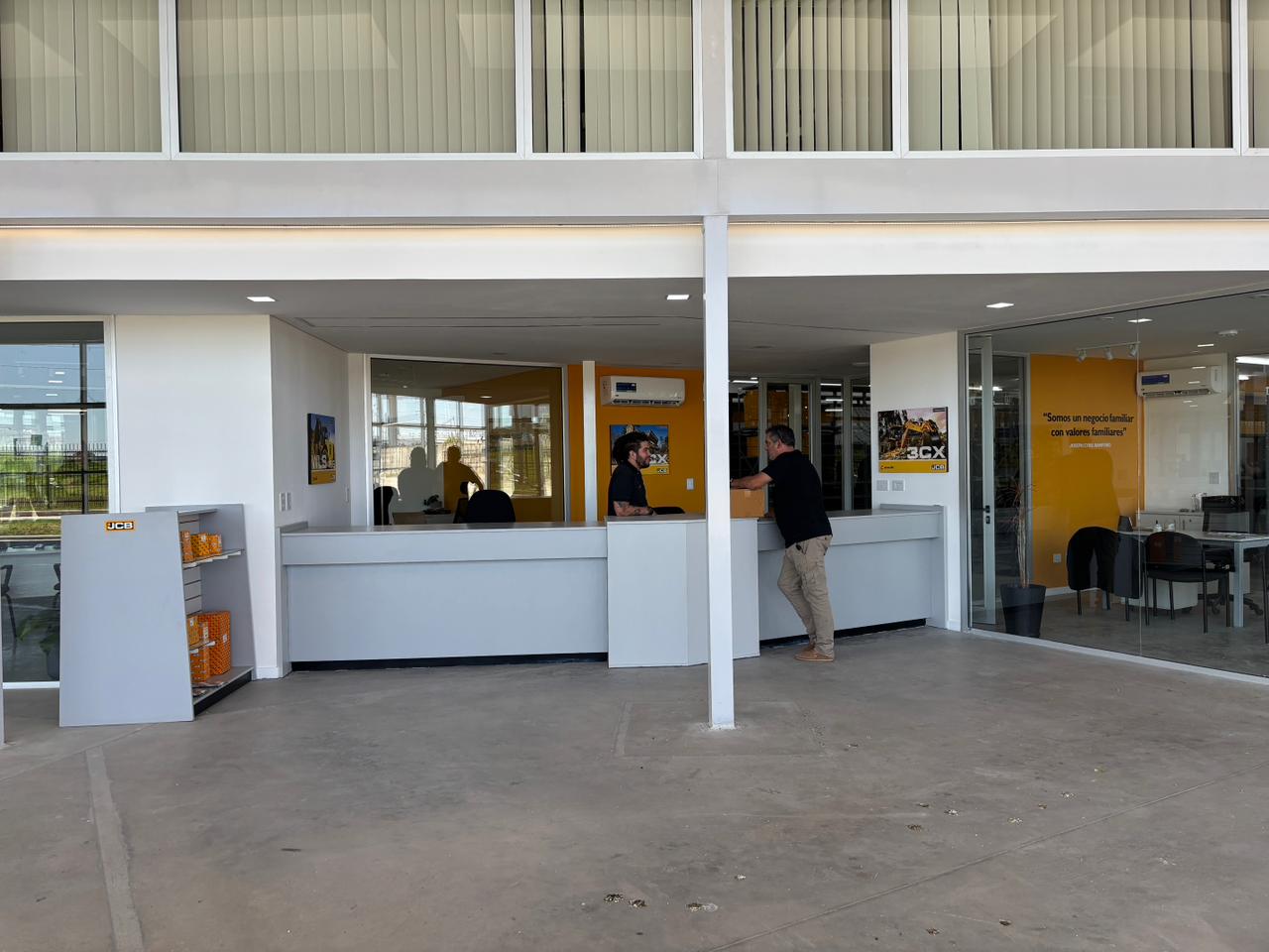 Oficinas | Organizadas en dos niveles: En planta baja se dispusieron los espacios correspondientes a las marcas JCB y Bauer, vinculados directamente con los sectores de trabajo, mientras que en planta alta se desarrollaron las oficinas administrativas generales del Grupo Criolani. El diseño buscó una distribución eficiente y coherente con la imagen institucional de cada marca, garantizando confort y funcionalidad.